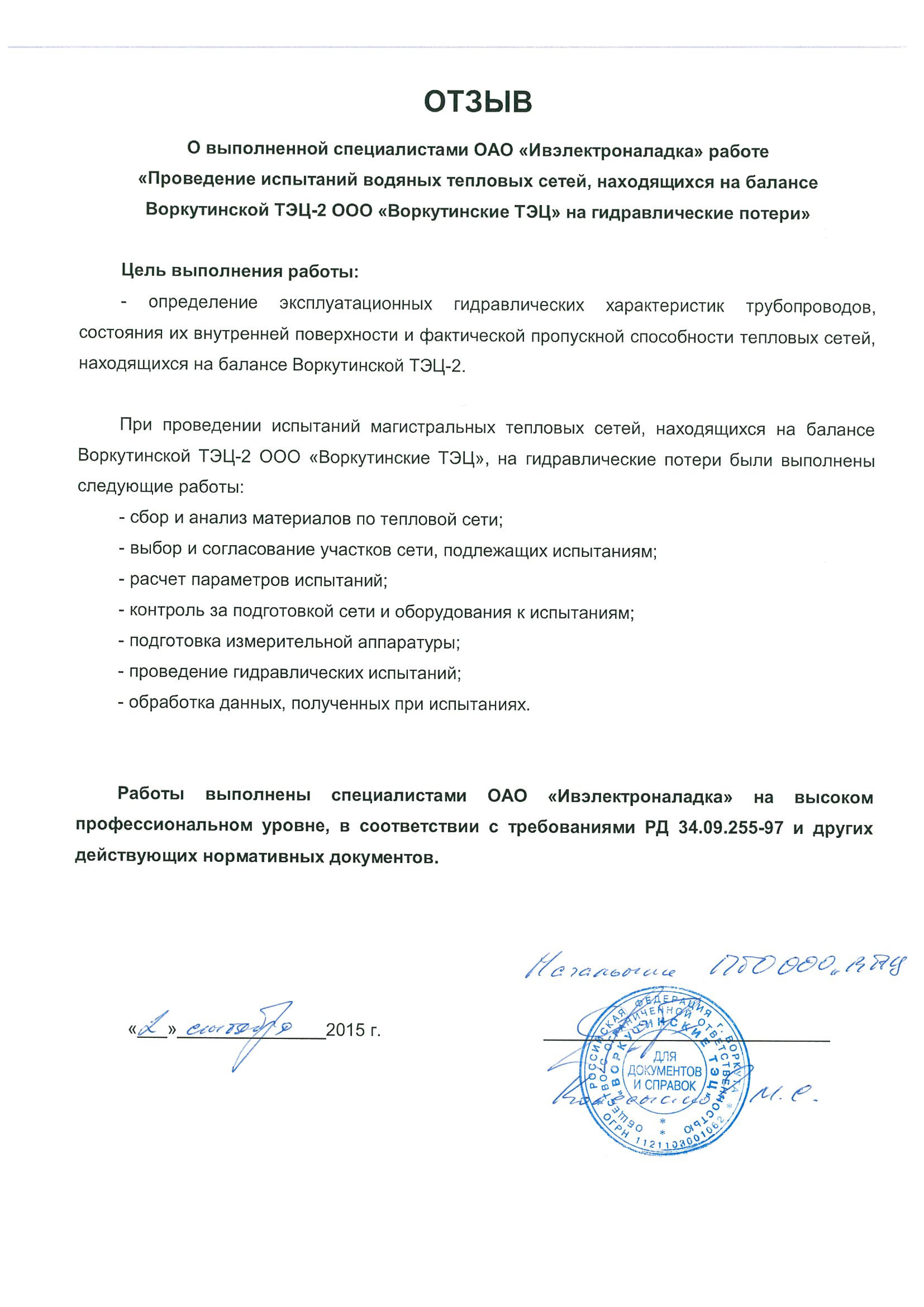 ОАО «Ивэлектроналадка» получен ряд положительных отзывов от ООО «Воркутинские ТЭЦ».